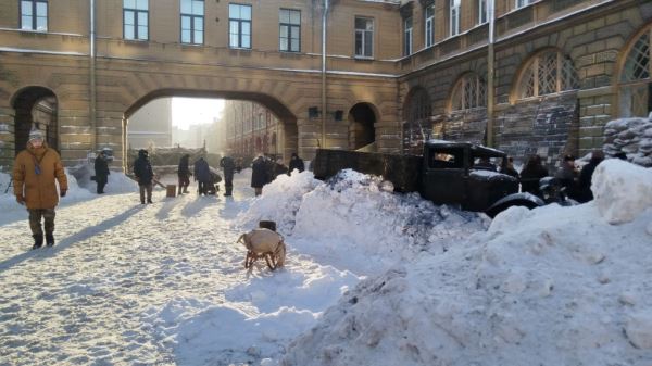 Каждую локацию готовили очень быстро. На натуре, на окна заклевали полосками белой бумаги. В блокаду это делалось, чтобы стекла не разлетались на мелкие осколки. Все признаки «современности» завешивали или маскировали. В этом году повезло со снегом. Более того, администрация города помогала съемочной группе, активно свозя снег на площадку. Однако избежать использования искусственного снега не удалось. Как оказалось, его недостаточно, чтобы изобразить блокадную зиму 1942 года — одну из самых холодных в истории города. В итоге сугробы художники возводили с помощью корсетов.
